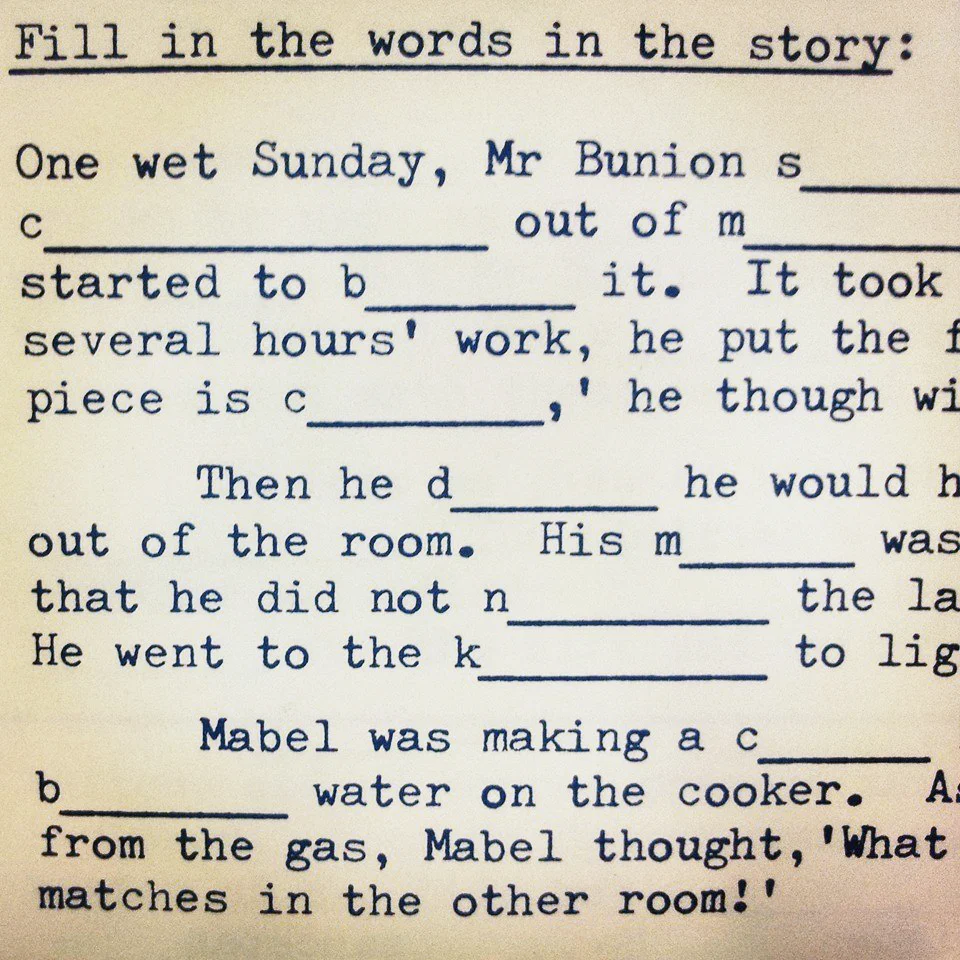 Displacements. A story is beginning within: Loss, suffering, endurance. Belonging. The idea floats for a moment then breaks off; slender, a tremor, now gone. The stories bubble up, some dissolve, and others stay. For instance, I was at a bar one night, seeing a few local bands. One of my friends was part of the line-up, and I had a brief chat with him before he was on. Shouting to make himself heard over the music, he told me about one of the Library Finds that had stuck most in his mind. It was one of my earlier finds, a page from a school primer where the students had to fill in the words in the story. My friend confessed upon seeing this image that he filled in every missing word with the foulest and most offensive words he could possibly draw up from the dark depths of his soul.