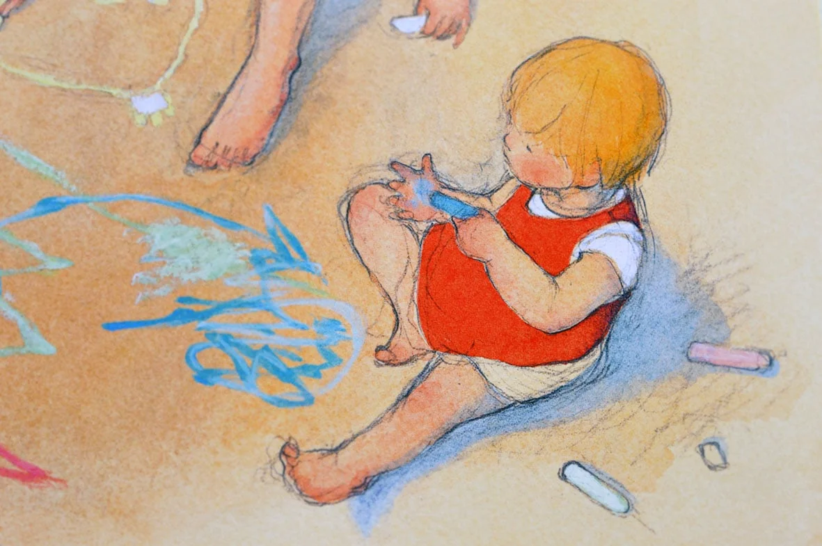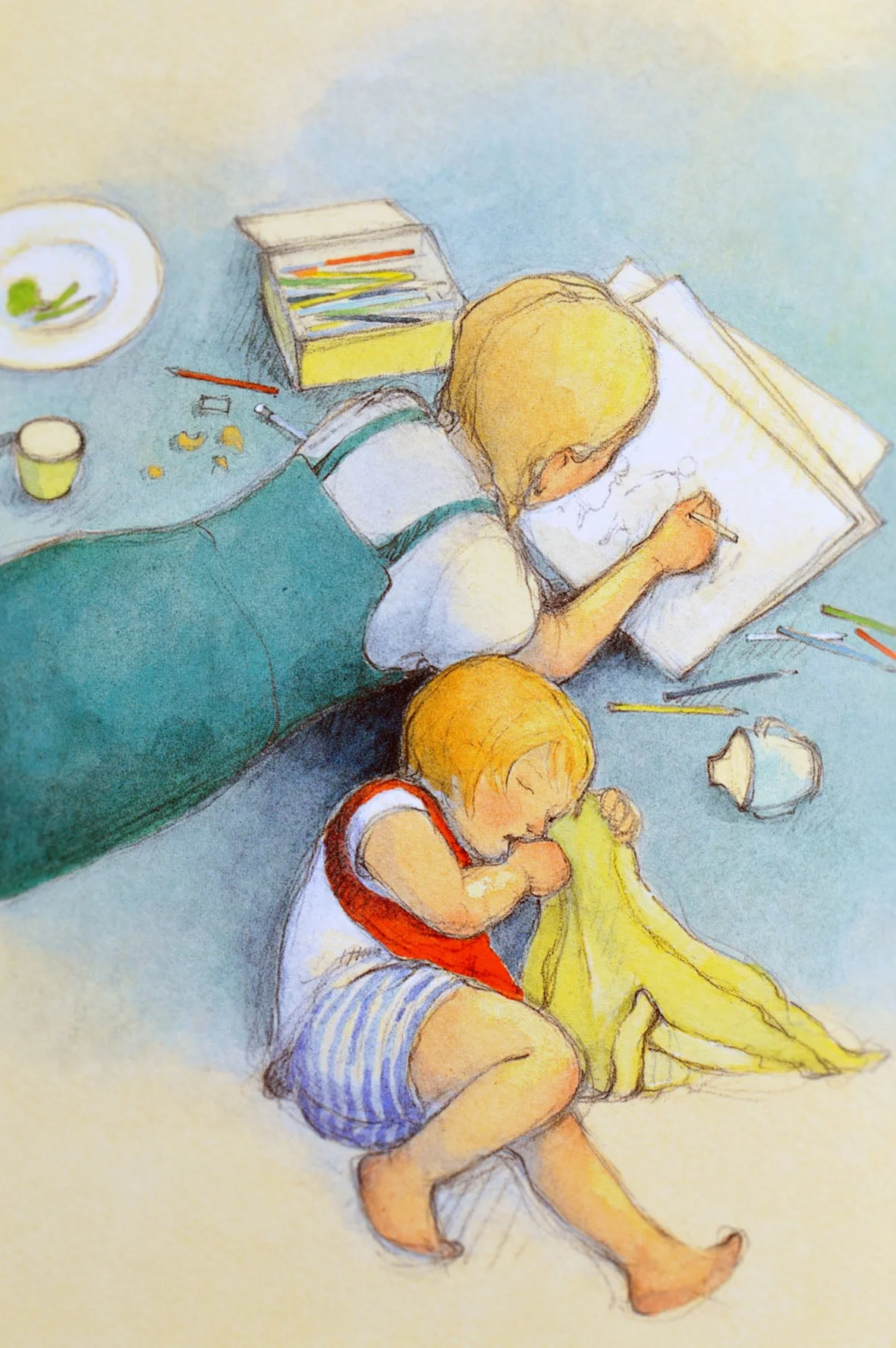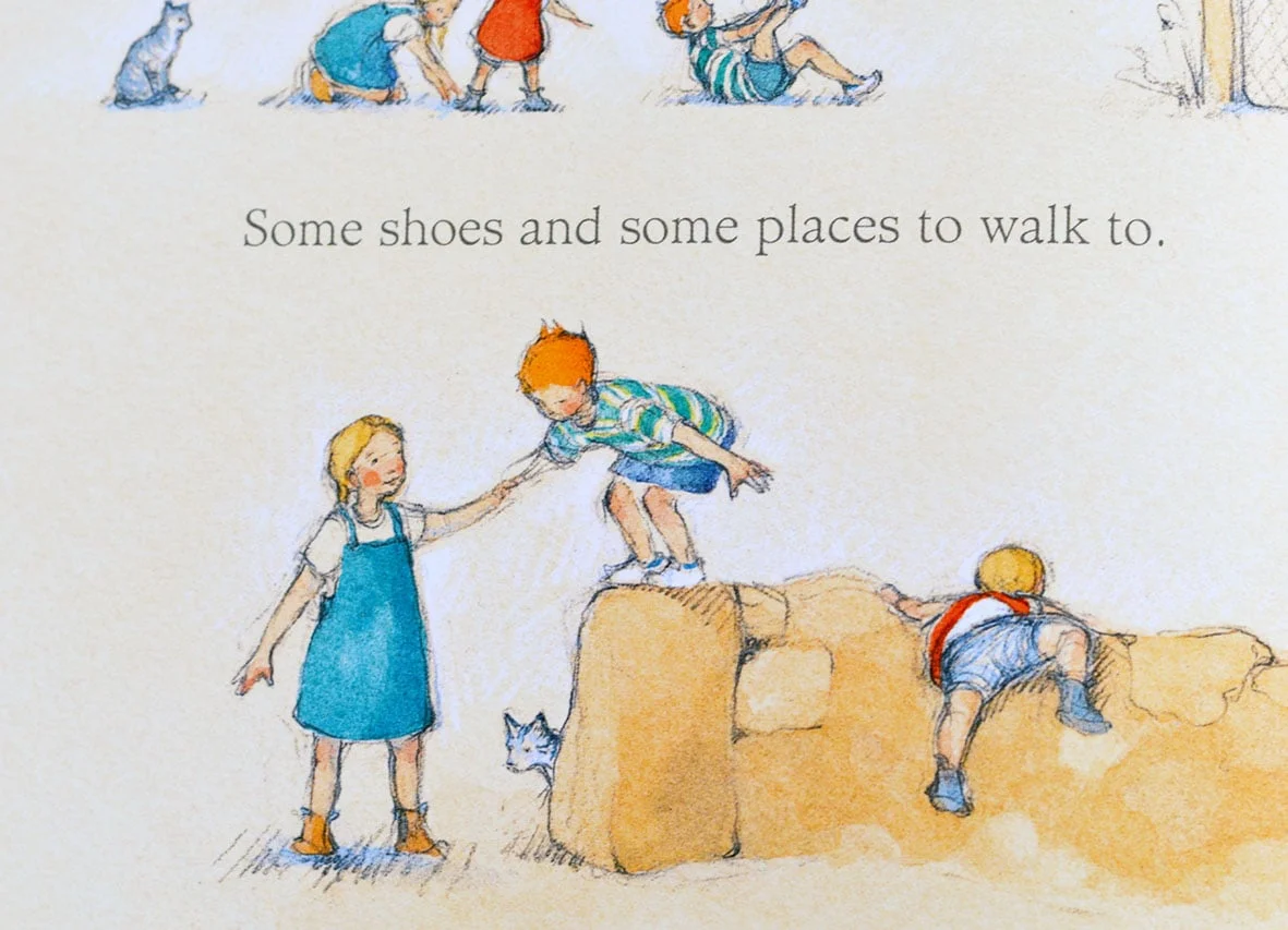Danny Parker’s simple verse is stunningly matched with Freya Blackwood’s illustrations —both seem to resonate with a quiet, heart-rending nostalgia. Blackwood is one of my favourite illustrators, and with her soft sketchy lines she captures the way children move and sit and interact like almost no-one else can. She tells me the story of my own childhood in pictures; big sister holding the hand of her younger siblings, leading the way, taking care to watch over them in the way that big sisters do. Blackwood based these characters on her friend’s kids, which may be one reason why her drawings are so exquisitely full of life.